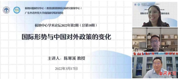 本网讯 3月17日下午,极地中心学术论坛2022年第2期(总第18期)通过“腾讯会议”网络平台开讲,广东外语外贸大学国际关系学教授、硕士生导师陈寒溪教授担任主讲人,畅谈 “国际形势与中国对外政策的变化”。我校督学顾也力出席论坛,论坛由极地问题研究中心主任刘兰凤主持。