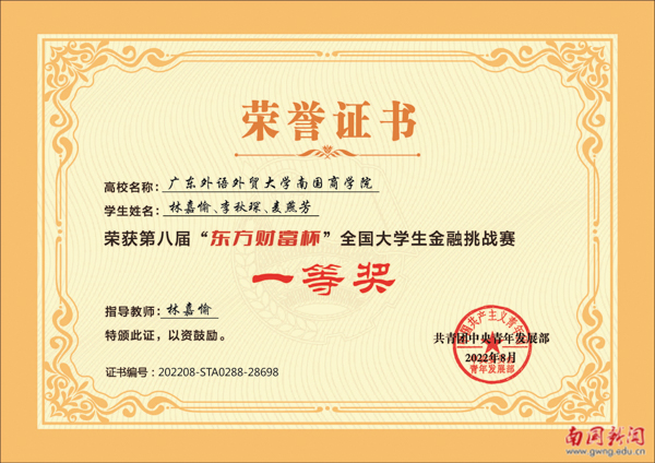 本网讯 近日,第八届“东方财富杯”全国大学生金融挑战赛颁发获奖证书。我校有10支队伍获奖,其中一等奖2项,二等奖2项,三等奖6项。