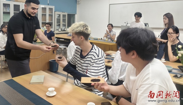 本网讯 茶香萦绕,品味悠长,茶叶在杯中轻舞飞扬,茶道礼仪韵味十足。4月18日和4月24日的晚上,我校教务处蔡海云老师分别于实验楼506室为南国的中外学子们带来了两节别开生面的茶文化体验课。来自黎巴嫩、叙利亚、韩国、俄罗斯、越南等5个国家的9位留学生与中国学生们欢聚一堂,共赏宋代点茶文化,体验盖碗泡茶。