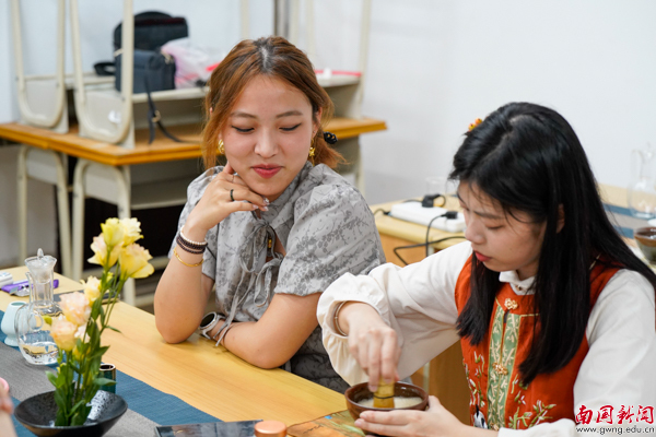 课后采访中,蔡海云老师表示,开展本课程的初衷在于使同学们深入了解中国传统文化,科学认识茶的健康价值,在生活、工作中学会泡好一杯茶,提升人文素养。对于当前网络关于“茶与咖啡孰优孰劣”的热议,她认为,年轻人对茶或咖啡的喜好并非是对立的,茶文化和咖啡文化可以相互融合、和谐共存,日常的饮用应该结合自己的习惯及需要进行选择。她指出两次体验课各有特色,宋代点茶使同学们,尤其是留学生们深入体验了宋代的雅致生活,领略中国传统茶文化的美;而盖碗泡茶,则让同学们了解茶桌礼仪,学会盖碗泡茶的完整流程,与茶有了更亲密的接触,初步掌握了从茶的形、色、香、味四方面品鉴一款茶。