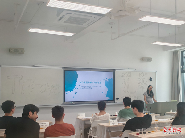 本网讯 为弘扬中华优秀传统文化,促进跨文化交流,4月17日下午,国际学院联合文化与传播学院在多语种教学楼成功举办“非遗扎染技艺体验课”。活动由汉语国际教育专业2022级许宝文、冯楚婷两位学生担任主讲“小老师”,在国际学院尹向红老师、文传学院汪贝娅老师的指导下,带领我校留学生沉浸式体验国家级非物质文化遗产扎染技艺,以艺术为桥深化文化理解。