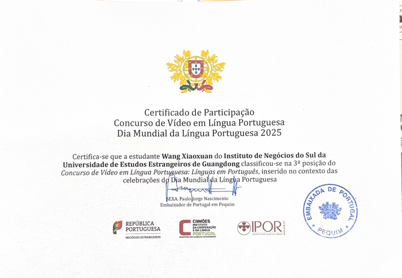 本网讯 6月16日,葡语系三位同学收到了“2025世界葡萄牙语日视频大赛”的获奖证书,该比赛由葡萄牙共和国驻华大使馆、卡蒙斯学院及东方葡萄牙学会于5月联合主办。经过激烈角逐,我校团队凭借其匠心之作,从全国参赛作品中脱颖而出,勇夺大赛季军,在国际舞台上展现了我院学子的卓越风采与葡语教学的质量成果。