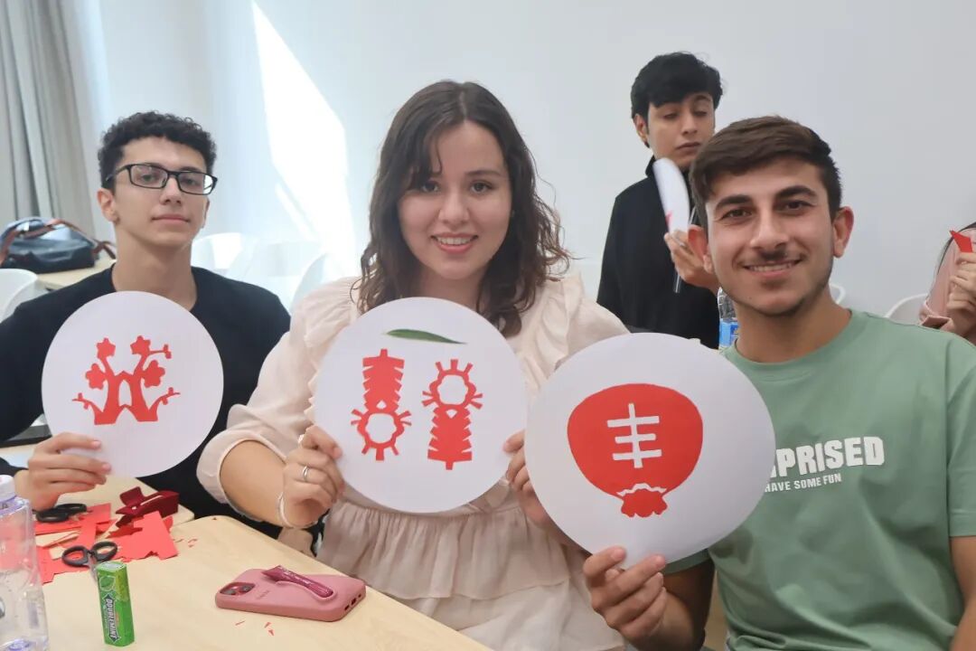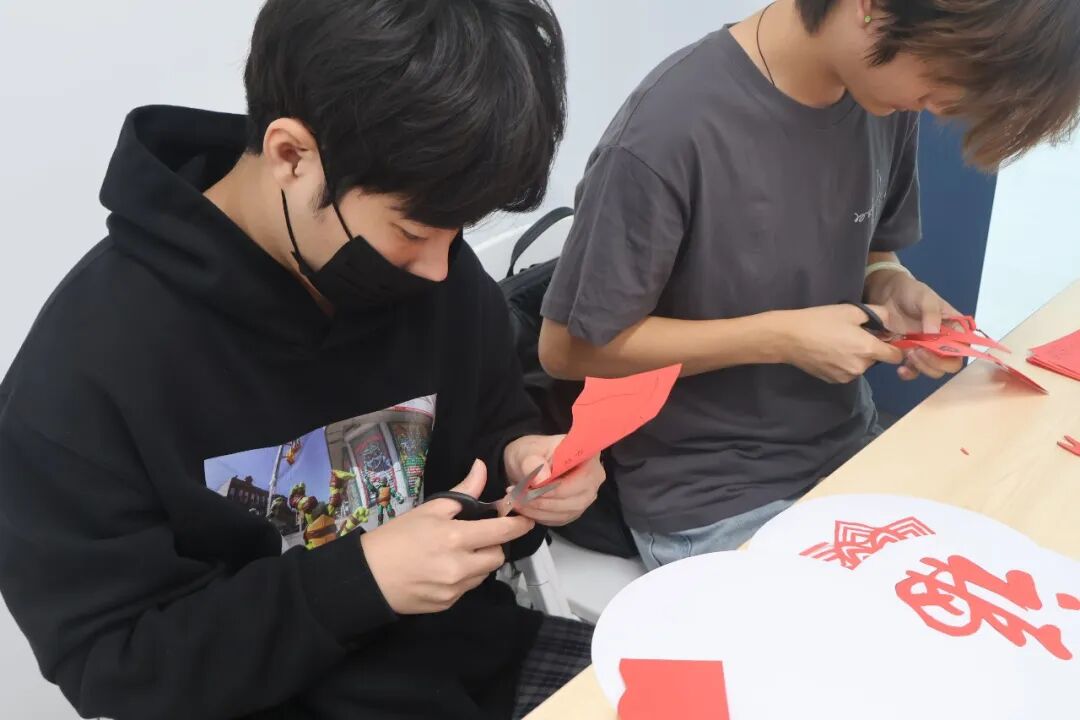 随后,留学生在汉语国际教育专业的同学们“手把手”的示范下,拿起剪刀开始自己的“创作”,时而沉思裁剪路径,时而相互交流创意,小心仔细地“雕琢”自己的作品。