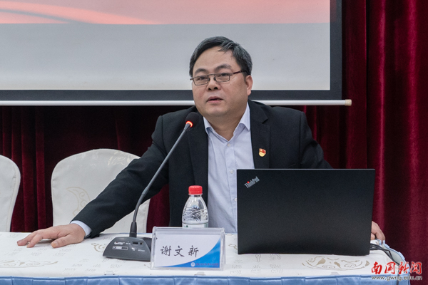 谢文新以“牢记初心使命跟党走,接续奋斗建功新时代”为题,由党在历史上两次重大的决议引入,阐述了党的十九届六中全会精神的主要内容。他强调了十九届六中全会的重大意义和中国共产党在时代发展历程中的重要地位,点明了第十九届六中全会的召开是中国共产党在重要历史关头做出的正确选择,体现了中国共产党高度的历史自觉和责任担当。