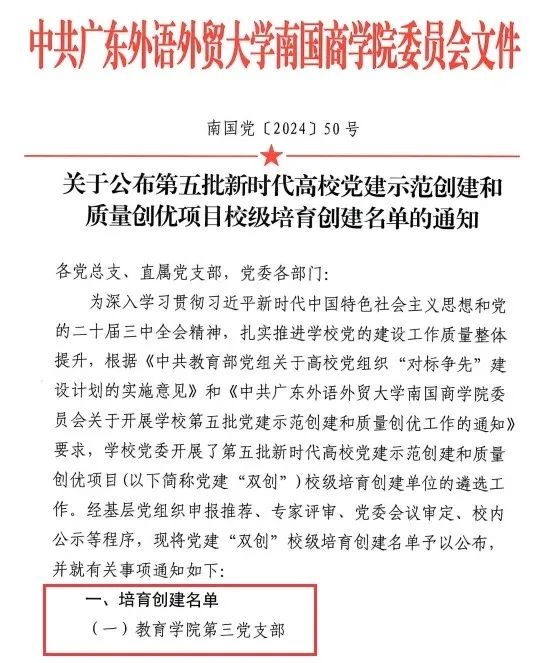 近日,学校党委公布学校第五批新时代高校党建示范创建和质量创优工作(以下简称“双创”)立项结果,教育学院第三党支部荣获学校第五批新时代高校党建“双创”工作“样板党支部” 立项。