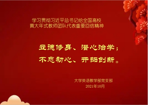 为深入贯彻落实教育部《关于学习贯彻习近平总书记给全国高校黄大年式教师团队代表重要回信精神的通知》的文件精神,大学英语教学部党支部了开展“向黄大年同志学习”活动。大学英语教学部全部党员同志参与了本次活动。