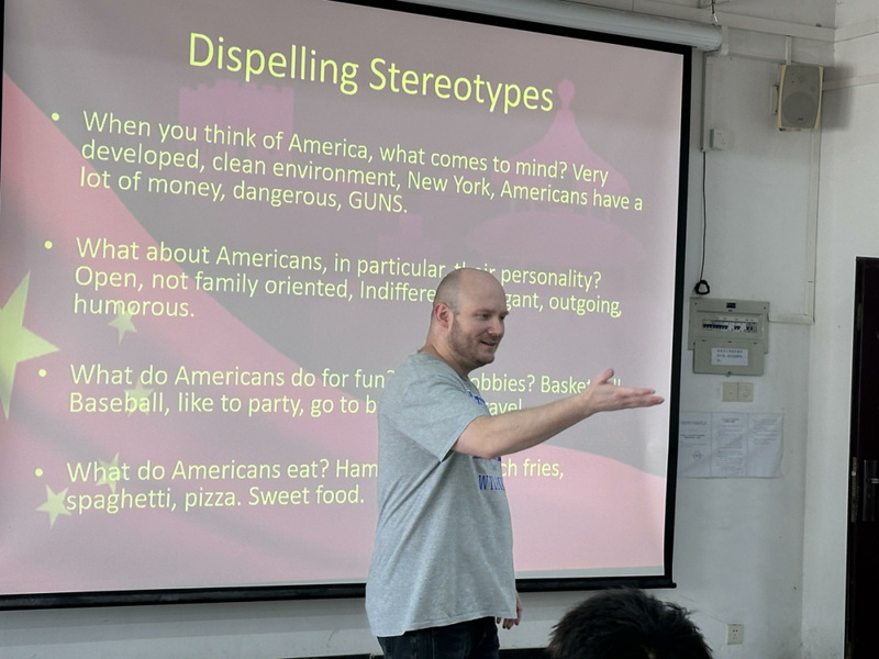 讲座伊始,Vincent 老师以互动问答切入,引导学生跳出 好莱坞滤镜下的美国想象。他首先以辩证思维勾勒出立体的美国形象:一方面是发达的经济体系、优美的自然环境与多元的文化生态,另一方面则直面枪支泛滥、社会撕裂等现实困境。在文化层面,他生动诠释了美式幽默的解构智慧、篮球文化的全民狂欢、派对社交等的开放特质以及甜食文化背后的生活哲学,生动的讲解让同学们也深刻体会到地域多样性对于一个国家内部文化差异的影响。