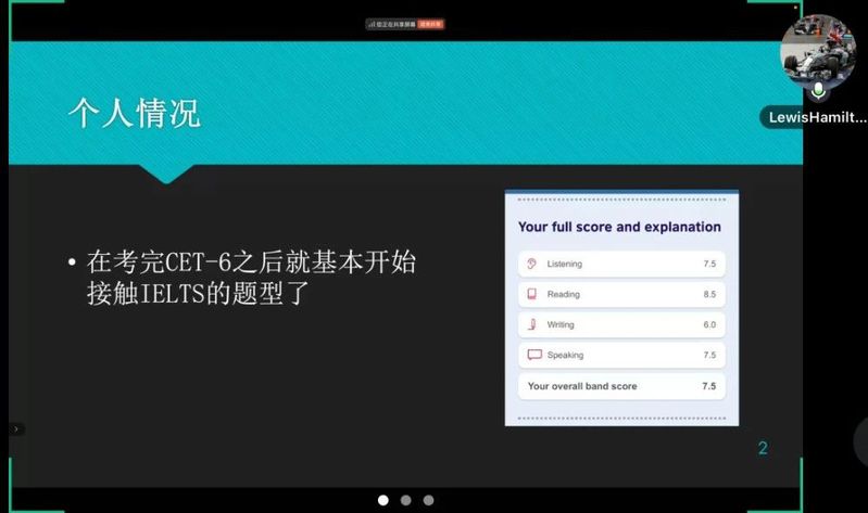20级创新班的郭晋诚同学细致介绍自己备考雅思考试的过程,无私分享了个人积累的备考经验。他强调在雅思考试中,词汇储备、阅读理解、听力技巧、写作能力和口语表达的训练对取得心仪小分和总分是极其重要的。以听力为例,可以使用专门的练习册训练常规单词的拼写,缓解抓笔忘词的症状;以口语为例,利用好学校和课堂资源,抓住机会练习表达能力。他表示要学会做长期的准备,在各类英语等级考试、英语竞赛中循序渐进,不断积累,最后水到渠成。