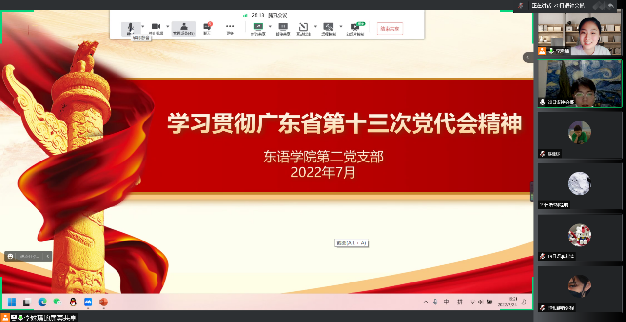 为进一步学习贯彻广东省第十三次党代会精神,切实领会其丰富内涵和实践要求,2022年7月24日晚,东语学院第二党支部以线上方式召开广东省第十三次党代会精神专题学习分享会。会议由支部书记李姝璠同志主持,支部全体党员与会。