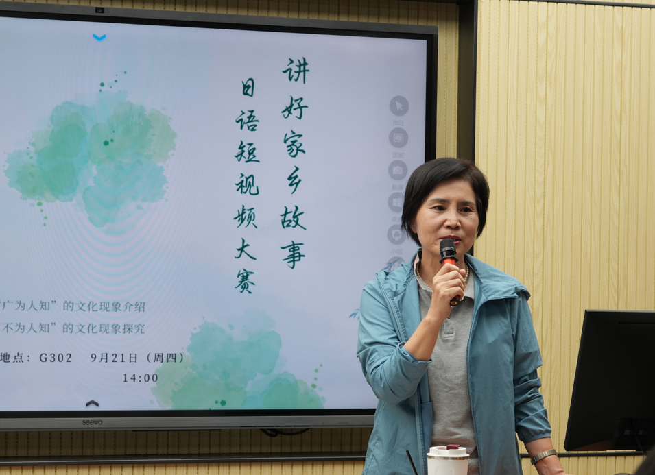 日语系主任曹美兰为本次活动致辞。她首先对获奖选手表示祝贺,认为“讲好家乡故事”日语短视频大赛在培养学生的家国情怀以及提升学生的日语综合运用水平方面有着积极意义。曹教授指出,东语学院始终致力于为学生打造形式多样的课外实践平台,日语系目前拥有演讲艺术实训基地、翻译实训基地、播音与主持实训基地和日语角,本次新成立的文化传播实训基地对接“讲好中国故事”系列学科竞赛,为学生提供语言训练+新媒体技术运用的实训机会,丰富了“随时随地学外语·讲外语·用外语”理念的内涵。