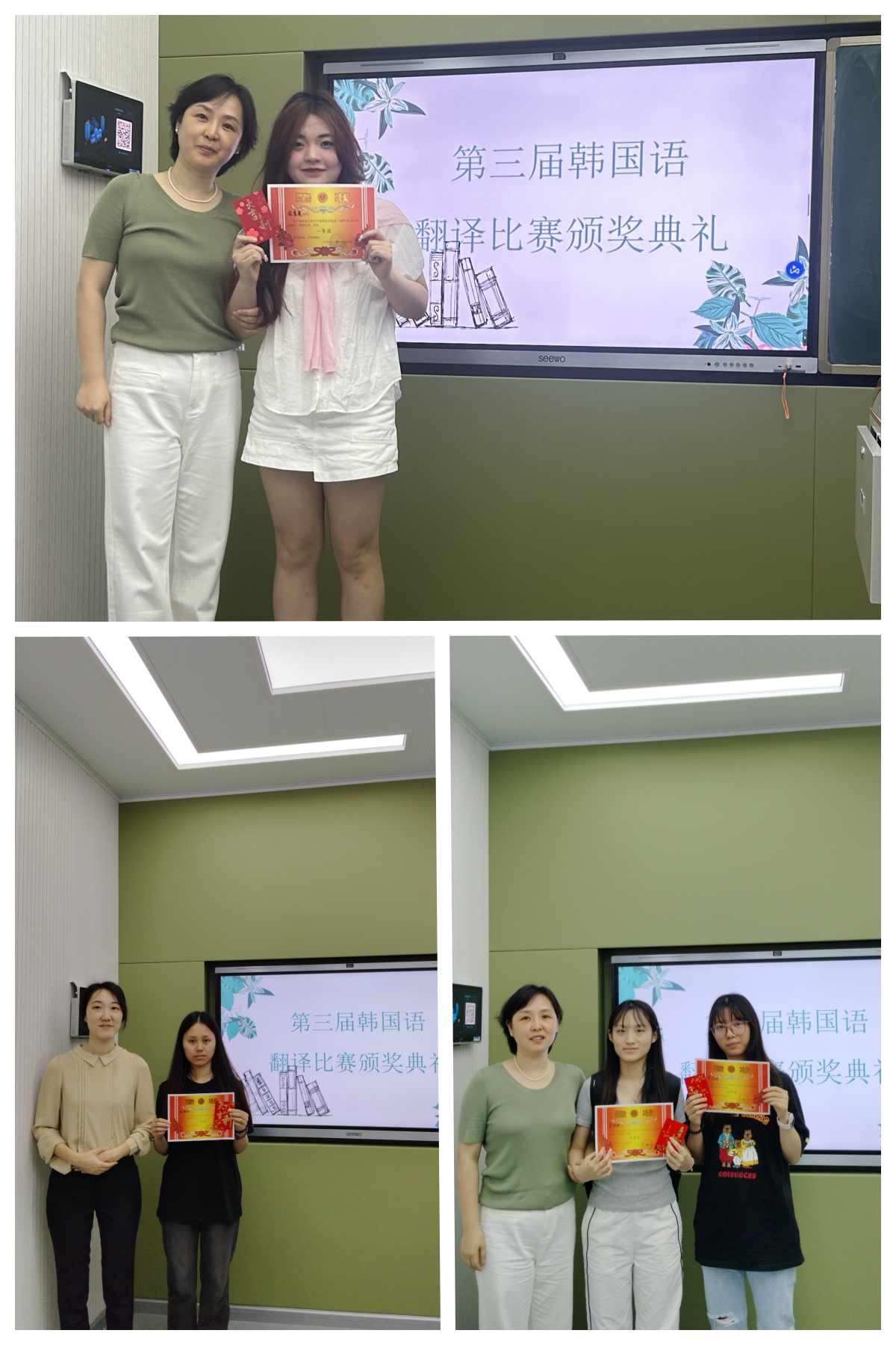 2024年5月17日,朝鲜语系举办了第三届韩国语翻译比赛颁奖仪式。朝鲜语专业二年级、三年级的全体学生参加了本次比赛,学生译文精美,通顺,精炼。学生赛出了风格,赛出了水平。