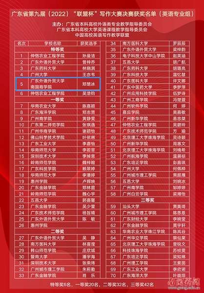 This excellent outcome in the competition is a showcase of SCBC’s strength in foreign language training. It is also the result of the teaching reform of English writing in the School of English Language and Culture(SELC) and the Faculty of College English(FCE) in recent years. The students’ achievement shows not only their ability to use English comprehensively, but also their creative ability to express themselves in English in writing. Writing is a basic skill in learning a foreign language, and improving students’ ability to write can in turn improve their other skills in using a foreign language.