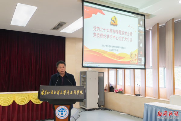 本网讯 12月15日上午,学校党委在C201学术报告厅召开党的二十大精神专题宣讲会暨党委理论学习中心组扩大会议,邀请广东省委教育工委党的二十大精神宣讲团成员、广东外语外贸大学谢迪斌教授在线上作题为《学深悟透党的二十大精神 推动教育事业高质量发展》的宣讲报告。学校党政领导班子成员,各单位副处级以上干部、各级党组织书记、全体辅导员参加学习。党委书记许志超主持会议。