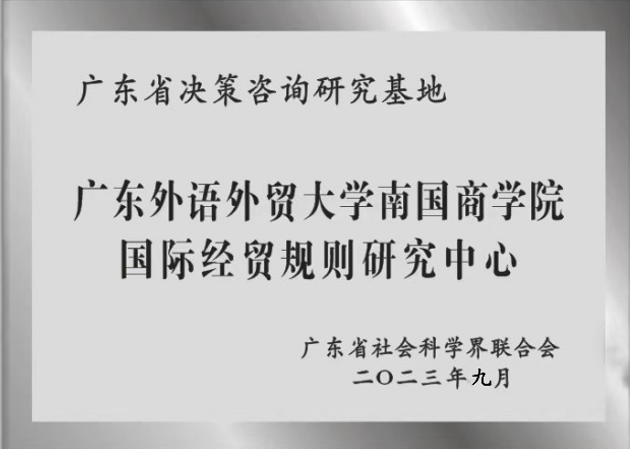 国际经贸规则研究中心是依托广东外语外贸大学南国商学院“国际经贸规则与标准研究基地”和经济学院,于2023年9月,经广东省社会科学联合会批准设立的广东省决策咨询研究基地。“国际经贸规则与标准研究基地”成立于2019年6月,致力于凝聚国内政产学研用各方面专业力量,共同研究国际经贸规则与标准,是中国国际贸易促进委员会商业行业委员会授予的全国首批研究基地,广东外语外贸大学南国商学院也是广东省唯一获此殊荣的民办高校。经济学院是南国商学院办学时间最长的学院之一,积淀了深厚的学科专业底蕴,主要培养具有数字思维与数字应用能力、国际化视野与较强外语能力、复合型、创新型、应用型经济类人才,现设有国际经济与贸易、金融学、经济学、税收学、投资学、电子商务等本科专业。学院现有国际经济与贸易学省级特色重点学科、金融学校级重点学科,国际经济与贸易专业省级一流专业建设点,“国际商务”和“金融”两个校级专业硕士学位建设点。近年来,中心取得丰富的研究成果。一是提交7份决策咨政报告,其中2份获广东省省委相关部门批示,4份被采纳;二是出版学术专著1本;三是发表论文12篇,其中核心期刊发表论文9篇;四是获批市厅级项目6项,横向项目1项。