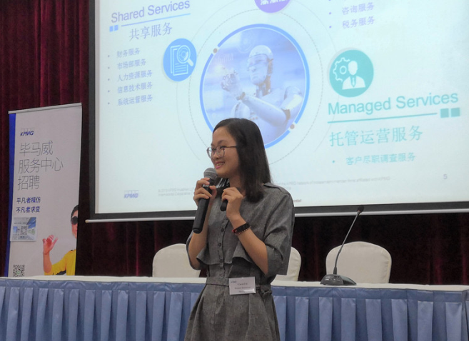 2019年9月26日下午3点,我校为了更好地拓宽毕业生就业以及在校生实习渠道,在管理学院院领导大力支持和会计系全力配合下,由管理学院主办、会计学会协办的佛山毕马威服务中心(KDC)校园招聘宣讲会于我校学术报告厅F101成功举办。出席本次宣讲会的嘉宾有毕马威审计部门经理Sarah、运营服务中心经理Iris、人力资源部经理Carol、人力资源部助理经理Bubble等。
