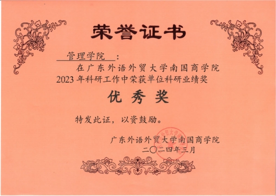 管理学院荣获单位科研业绩奖优秀奖,这充分体现了学院在科研方面的卓越表现和突出成绩。这一荣誉不仅是对管理学院过去一年科研工作的肯定,更是对学院科研团队持续努力、积极创新的认可。这一奖项的获得,将进一步激发管理学院教师的科研热情,推动学院科研工作的深入发展。