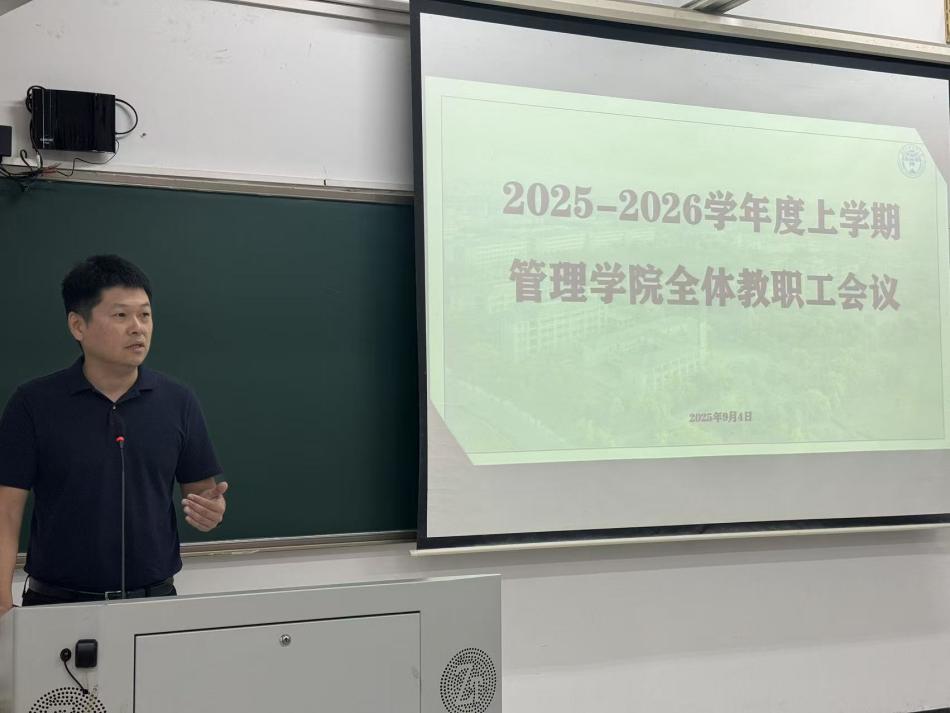 2025年9月4日,管理学院在G303召开了2025-2026学年第一学期全体教师会议。本次会议由管理学院执行院长文佑云教授主持,党总支书记黄汉成,副院长陈书星,院长助理吴娜妹及全体教师出席了会议。