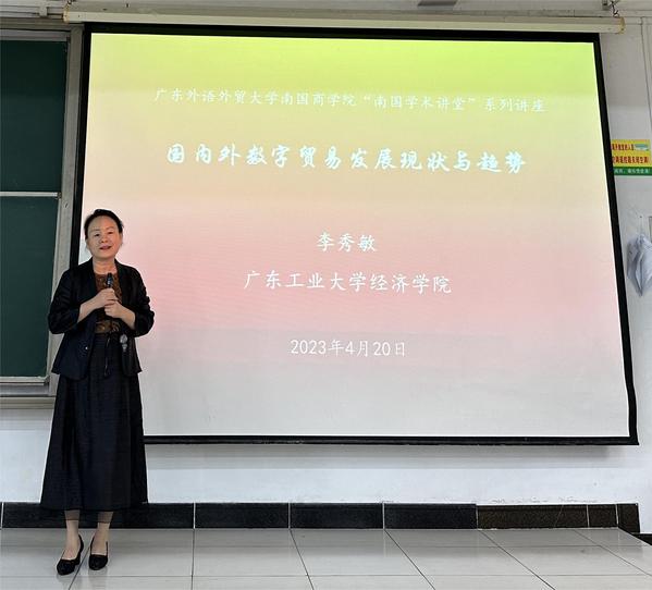 本网讯 4月20日下午,经济学院邀请李秀敏教授开展“南国经济大讲堂”第11期讲座,主题为“国内外数字贸易发展的现状与趋势”。讲座由经济学院副院长李玥主持,学院全院教师以及国际经济与贸易专业部分学生参加。
