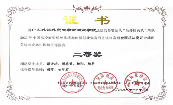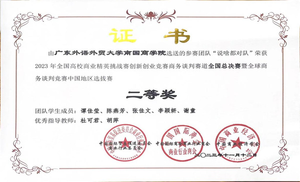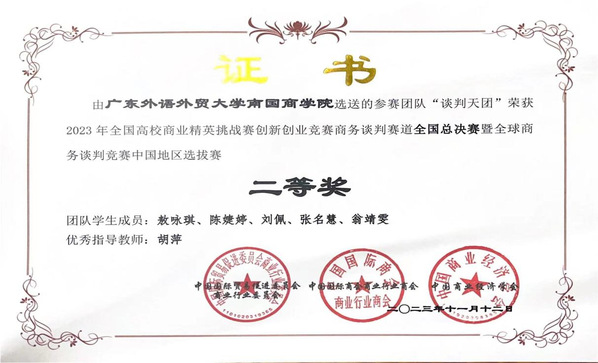 本次大赛面向全国各高校的经管类专业学生,竞争激烈,我校经济学院的三支队伍从中脱颖而出,荣获全国二等奖,这离不开学院的支持和老师、学生的共同努力。经济学院一直注重营造良好的竞赛氛围,认真做好比赛各个环节的准备工作,旨在通过比赛将课堂理论知识运用到实践当中,锻炼学生的学科素养、创新思维和应用能力,为社会培养应用型、复合型和创新型国际经贸人才。(图、文:谭佳莹)