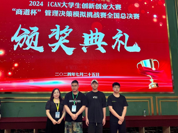 近日,2024年iCAN大学生创新创业大赛(教育部A类赛事)“商道杯”管理决策模拟挑战赛全国总决赛在安徽合肥落下帷幕。我校经济学院22级金融学梁禧贤、南丁墅、陈旭顺同学组队的“干大事队”取得了全国总决赛三等奖的好成绩。此外,21级金融学谭钰婷、林泳茵、石林灵组队的“南国iCAN队”和“干大事队”还斩获了两个区域赛(南区)一等奖。