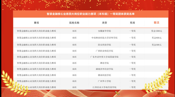 在党雪老师和梁少毅老师的精心指导下,一支学生团队在智慧金融核心业务赛项中以第五名的优异成绩,荣获团队一等奖。其中,23级金融学(专升本)的马献娟同学和23级金融学的罗娉婷同学分别在客户经理岗和综合柜员岗中以第一名和第七名的优异成绩荣获个人一等奖;22级国际经济与贸易(双语)的曾玮琪同学和22级金融学的梁禧贤同学分别在理财经理岗和大堂经理岗中获得个人二等奖。梁少毅老师和邓永亮老师指导的另一支学生团队(23级金融学专升本陈佩君、沈林英、陈锐泓、陈慧彤;22级国际经济与贸易袁炜;23级电子商务步画闽)在数字银行模拟经营沙盘赛项中荣获第二名,同样获得团队一等奖。党雪老师和徐浩老师指导的三人团队(22级金融学梁佩婷;22级国际经济与贸易卢婕妤、王馨悦)在保险创新科技赛项中获得团队三等奖,梁同学和卢同学分别荣获个人二等奖。邓永亮老师和梁少毅老师指导的另一支三人团队(22级市场营销郑铭萱、22级网络工程王越泽、22级财务管理李凤)在互联网金融创新与运营管理赛项中获得团队三等奖。