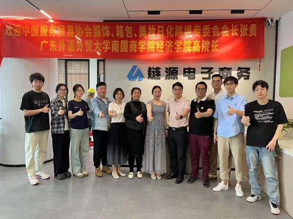 本网讯 2025年4月15日,经济学院副院长高洁、电子商务专业负责人郭烨,西方语言文化学院书记高彩云、西班牙语专任教师李翔,带领多语种跨境电商直播中心部分同学,前往中国服务贸易协会美妆、服饰、箱包专委会,广州涟源电子商务有限公司开展参观调研活动。
