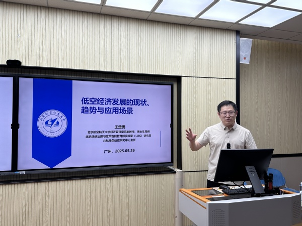 本网讯 2025年5月29日下午,经济学院在G302课室隆重举办了一场学术讲座,特邀北京航空航天大学经济管理学院副教授、博士生导师王楚男,围绕“低空经济发展现状、趋势与应用场景”这一前沿主题展开深入讲解。讲座由经济学院副院长王继洲主持,吸引了学院全体教师及部分学生的积极参与。