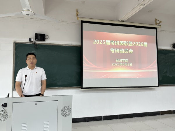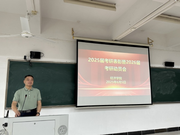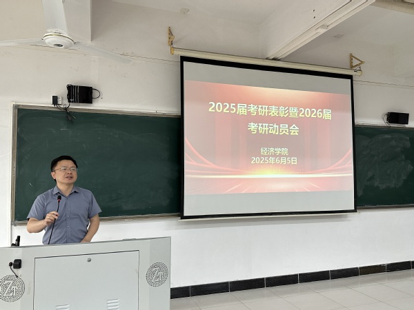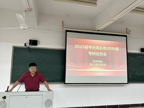 本网讯 2025年6月5日下午,经济学院召开2025届毕业生考研表彰暨2026届毕业生考研动员会,旨在表彰优秀考研学子,激励更多同学积极投身考研征程,为未来的学术和职业发展奠定坚实基础。院长苏武俊,党总支书记卢少勇,副院长王继洲、李玥,全体辅导员参加本次会议。广东财经大学招生考试处副处长吴玉强、我校教学质量监督与评估中心主任李焕荣受邀作专题辅导。会议由副院长王继洲主持。