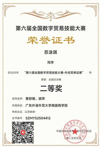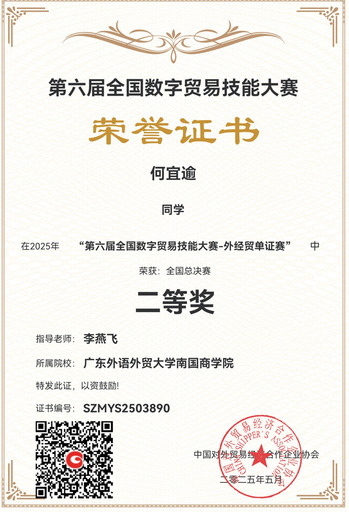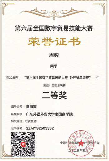 近日,由中国对外贸易经济合作企业协会主办的第六届全国数字贸易技能大赛正式落下帷幕。我院学生团队在李燕飞、夏海霞、黄财明、胡萍等老师的指导下,凭借扎实的专业知识和出色的团队协作能力,在外经贸单证、关务与外贸服务赛项两个赛道,共获得全国一等奖1项、二等奖4项、三等奖7项,充分展现出师生的专业实力和创新精神。