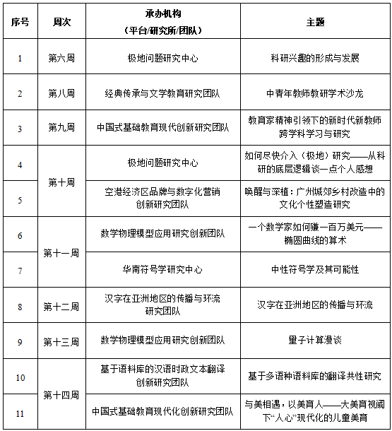 为鼓励学术争鸣、活跃学术思想、营造自由探究的科研氛围,弘扬敢于质疑、勇于创新、大胆探索的学术精神,根据学校科研事业“十四五”规划,学校开设南国“争鸣”系列学术沙龙。“争鸣”系列学术沙龙旨在为各省部级科研平台、校级研究所、省级及校级科研创新团队宣传学术成果、阐述理论观点、激发学术灵感提供良好的平台,同时为我校教师特别是中青年教师开展学术交流与研讨营造良好的氛围,沙龙活动由科研处、教师发展中心主办,各省部级科研平台、校级研究所、省级及校级科研创新团队等承办。2024年上半年,南国“争鸣”学术沙龙共开展10场,每场反响热烈,得到了师生们的高度赞扬和好评。经征集及初步审核,现公布2024年下半年南国“争鸣”学术沙龙计划,具体时间及地点另行通知,欢迎全校师生踊跃参与。