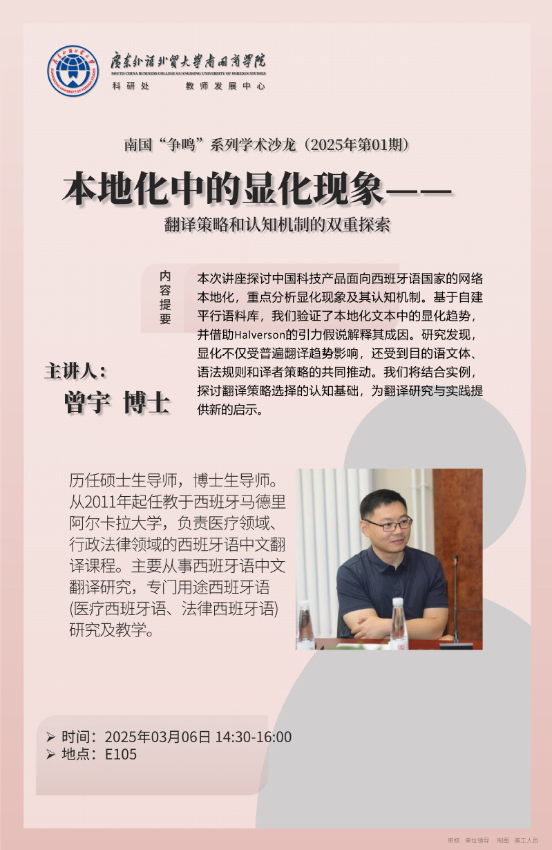 本校定于2025年3月6日14:30-16:00在教学楼E栋105室举办南国“争鸣”学术沙龙(2025年第1期)本地化中的显化现象——翻译策略和认知机制的双重探索。
