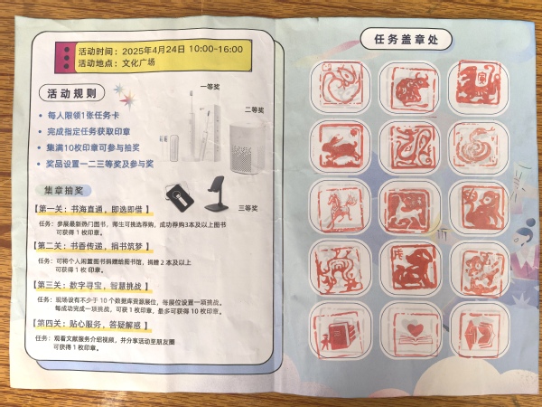 活动现场气氛热烈,师生们穿梭于各主题摊位参与集章挑战,欢呼声与喝彩声交织回荡。本次活动创新设置了即选即借新书专区,2000余册新书供读者自由挑选借阅;同时五子棋、丢沙包、连连看、投壶等趣味关卡吸引师生集章挑战。参与者集齐10章即可参与幸运抽奖,累计15枚可赢特等奖。
