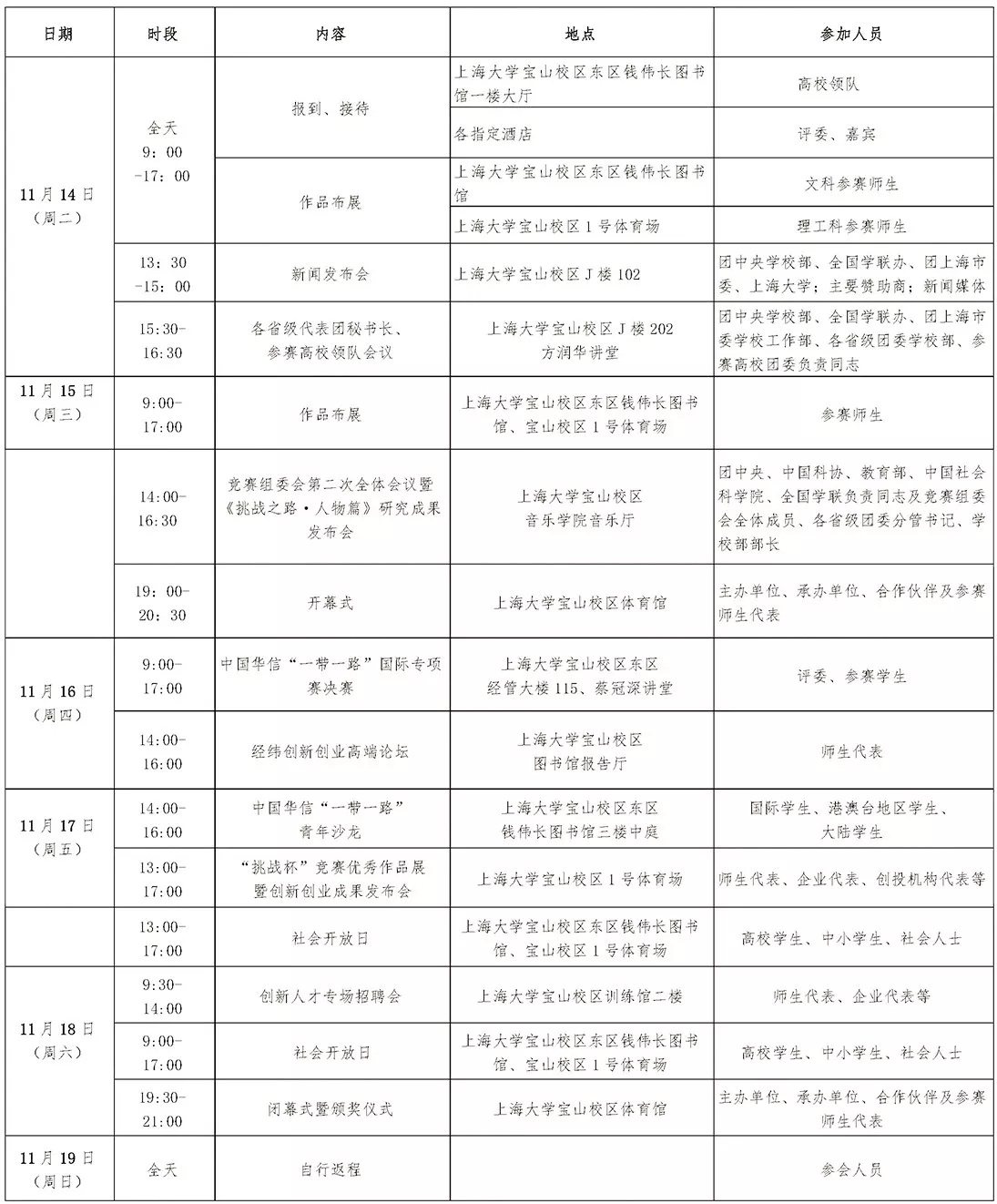 3. 2017年11月15日19:00-21:00,第十五届“挑战杯”全国大学生课外学术科技作品竞赛开幕式,闭幕式(2017年11月18日19:00-20:30)