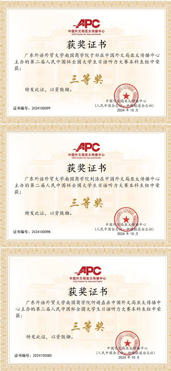 本网讯 近日,第二届“人民中国杯”全国大学生日语听力大赛获奖结果揭晓。我校共有3名同学荣获本科组三等奖,8名同学荣获本科组优秀奖。此外,我校还荣获了“优秀组织奖”,充分展示了我校日语专业的教学成果。