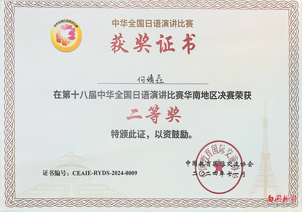 此次比赛成绩的取得,不仅是对何婧垚个人语言能力和文化素养的肯定,更是对广东外语外贸大学在国际交流与语言教学领域卓越水平的彰显。未来,东语学院日语系将继续支持学生参与此类活动,为他们提供更多展示自我、锻炼能力的平台,助力更多学子在专业竞赛舞台上绽放光彩。(东语学院 曹美兰、尹国鹏)