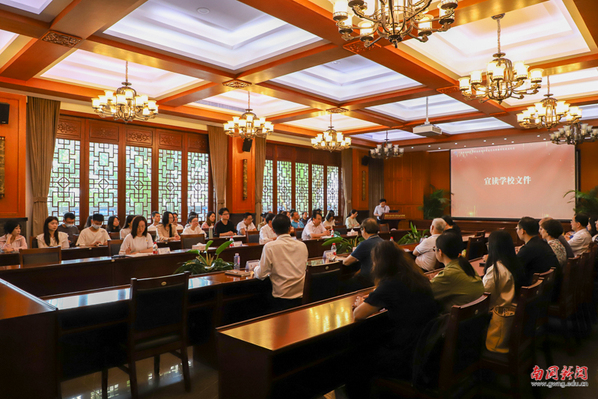 王华校长在讲话中指出,两院合并是学校“十四五”规划中组织变革的重要举措。他强调,合并虽带来融合成本与情感挑战,但通过组织变革能激发新活力,为学科交叉创新提供更广阔平台。王华回顾了两院的历史成就及两院领导的无私奉献。他要求全体教师统一思想,缩短磨合期,强化团队建设与产教融合,以“南国文传”新品牌为目标,探索人才培养与科研创新的高质量发展路径,为地方及国家战略输送高素质人才。