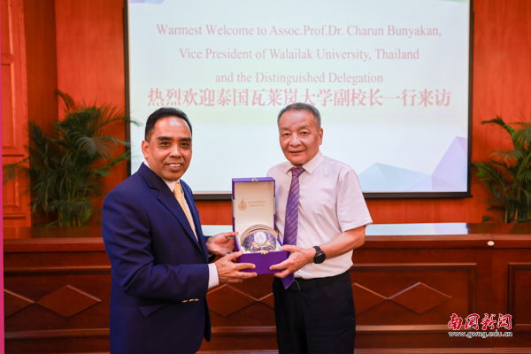 瓦莱岚大学人文学院副院长Dr. Kamontip Klaibanmai提出开展泰语课程共建、师生交流及学术合作,并配套泰语文化课程、国际奖学金及文科博士项目,推动跨文化教育创新等方面的合作构想。瓦莱岚大学人文学院院长助理Aj.Theerawat Klaokliang 详细介绍该校泰语特色课程,并就两校合作提出了具体方案。随后,双方聚焦相关议题及实施细节等交换意见。会后,双方互赠纪念品并合影留念。
