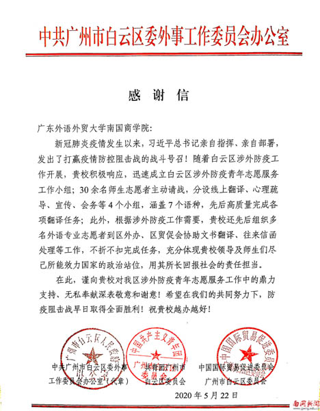 | 白云区团委区贸促会向广外南国涉外防疫志愿工作赠送感谢信 |