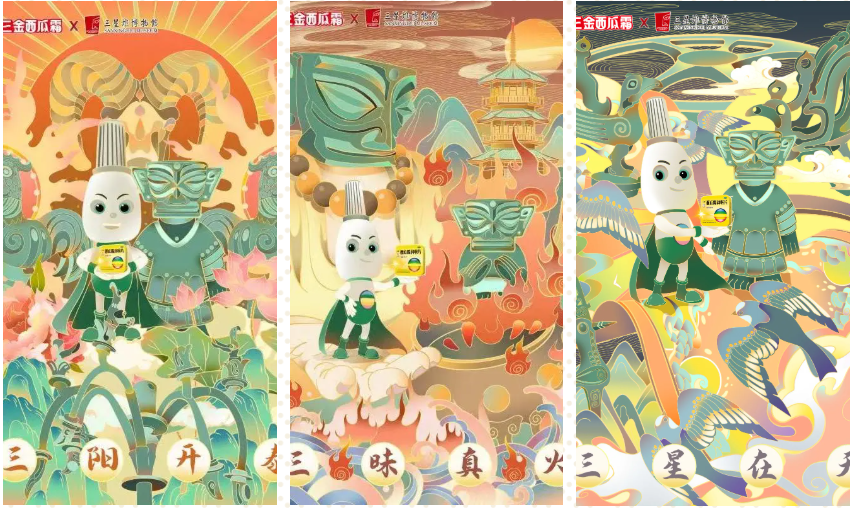 创作思路:作品提取三金与三星堆的“三”,衍生出相关概念的三张系列主题海报,表达美好愿景,突出产品功能,同时赋予传统文化视觉美感。