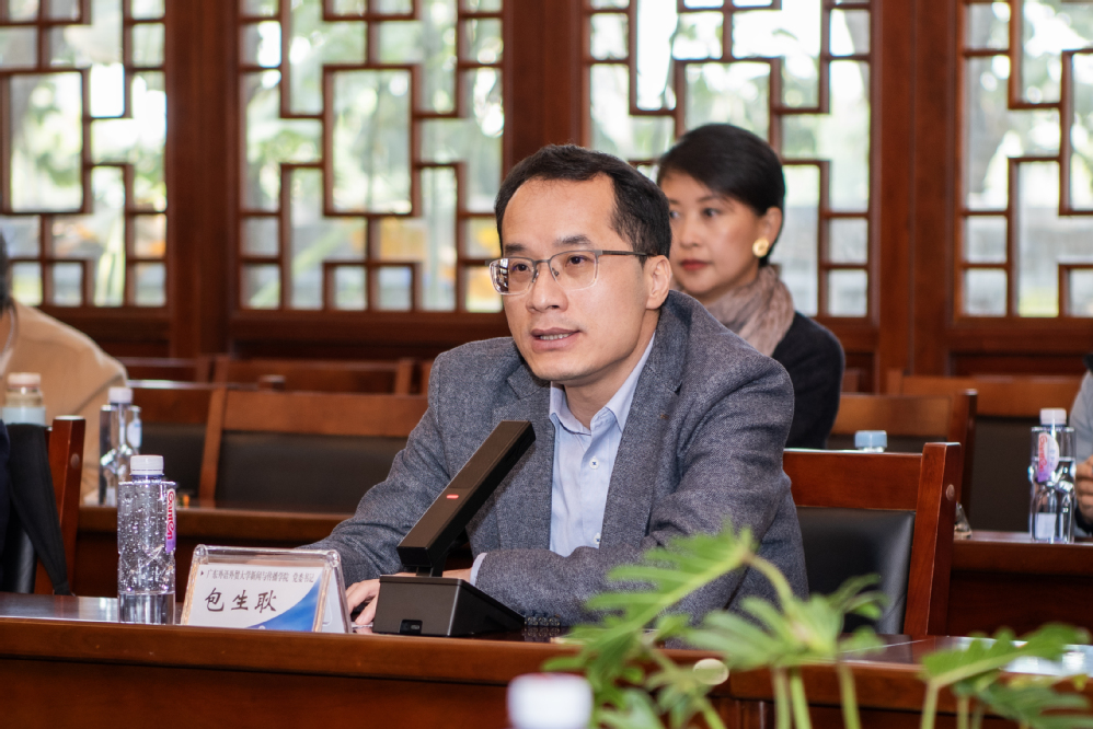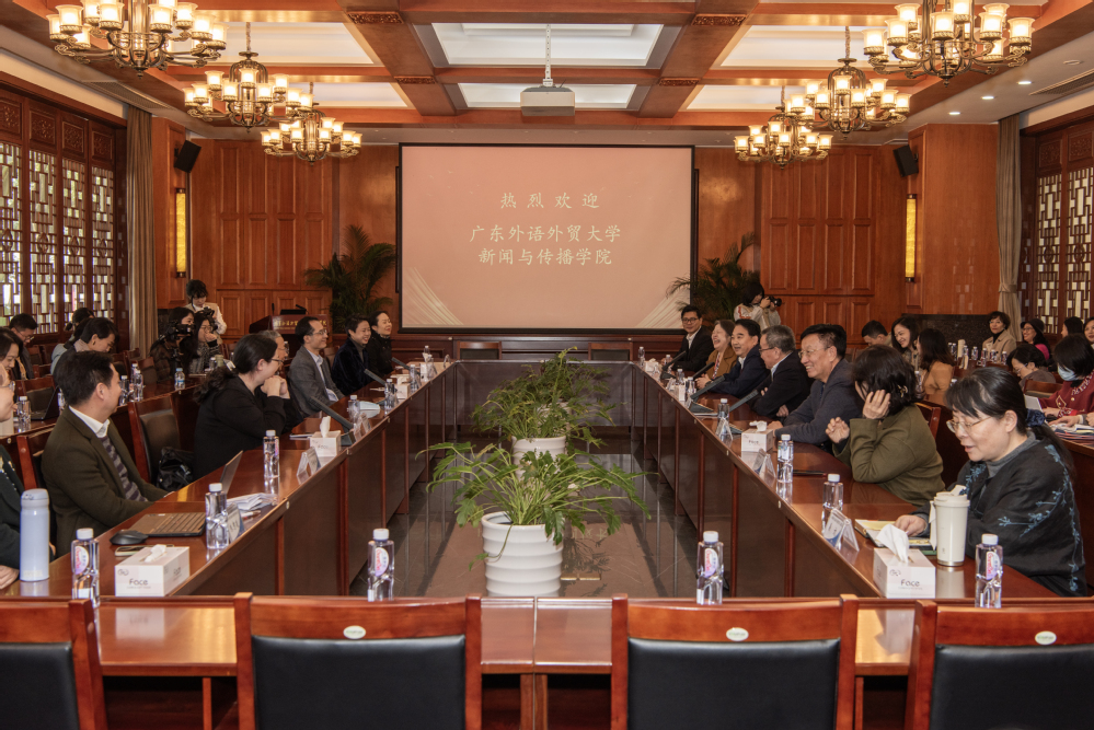 本网讯(记者:邵俊超)2025 年 1 月 6 日,广东外语外贸大学新闻与传播学院(下称“广外新传学院”)一行到访南国商学院“研究生优质生源基地”进行深度访问交流,共同探讨高层次人才培养。南国商学院督学顾也力、副校长赵福春、副校长王关义,广外新闻与传播学院院长侯迎忠、党委书记包生耿等领导出席活动。