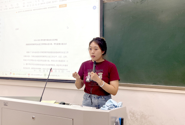 王玥老师作为中国语言文化学院资助负责人,她结合工作实际,分享宝贵的经验。她详细阐述了家庭经济困难学生认定评议小组的重要性,指出认定评议小组成员中,要合理配置学生代表人数,确保认定评议小组成员构成具有广泛的代表性。接着王玥老师为大家介绍了评议标准的具体内容,包括家庭收入、负担情况、特殊情况等多个维度,通过真实案例,从学生的教育支出、生活费用、家庭负担等不同角度,深入剖析了如何更好开展评议工作。