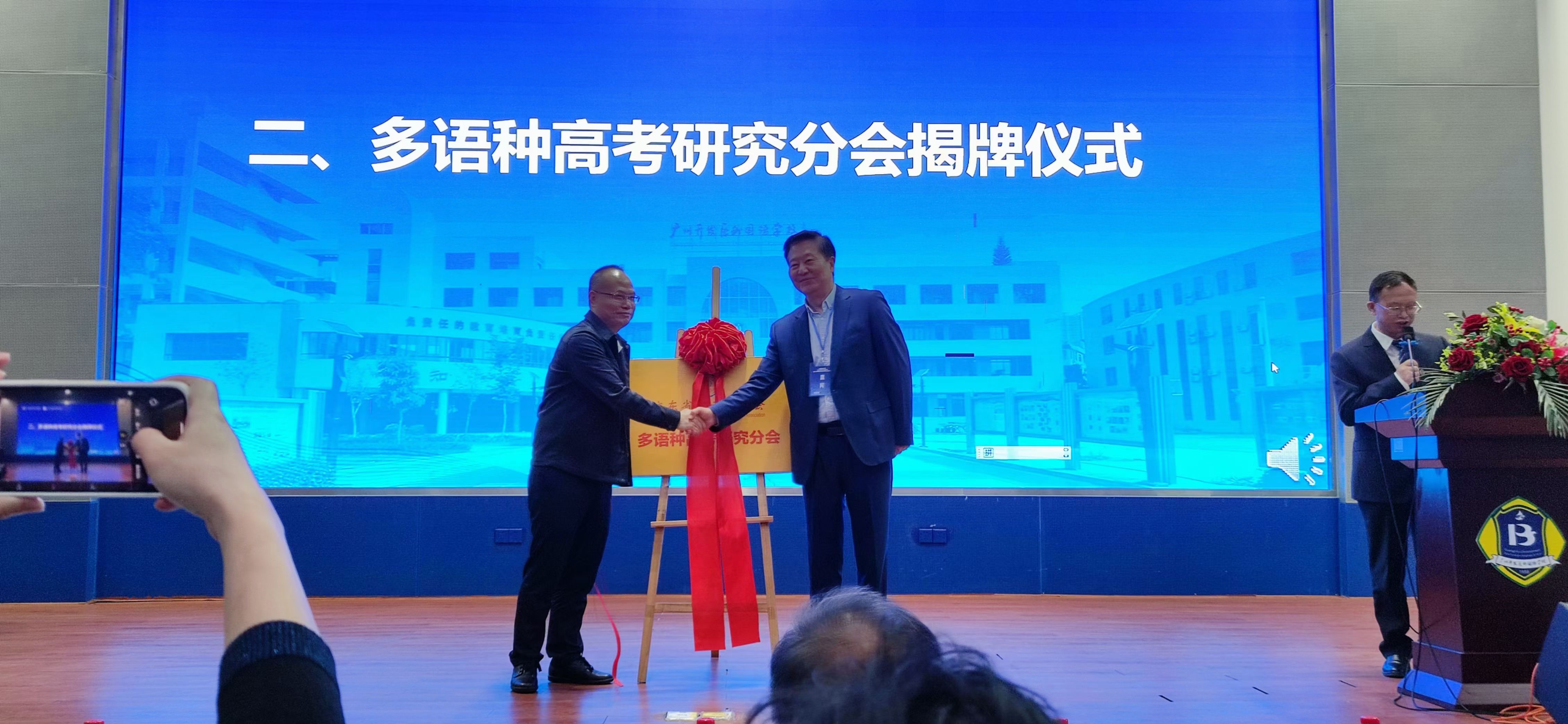 研讨会伊始由广东省高考研究会多语种高考研究分会王铭玉会长与广东省高考研究会理事长郭伟松教授共同为广东省高考研究会多语种高考研究分会揭牌。随后,王铭玉会长为广东省高考研究会多语种高考研究分会的第一届领导班子颁发聘书。