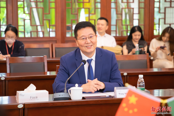 王铭玉致欢迎词。他代表学校对三国驻广州总领事代表团的来访表示欢迎,并介绍了我校办学定位、学院建设、学科开设情况,他强调我校“三色共谐”(国际化底色,外语特色,复合与实践亮色),“三文共进”(文理共融、文化互译、文明互鉴)的办学理念。王铭玉介绍,学校于2016年开设葡萄牙语专业,学生们在各类大赛中屡获佳绩,已培养了三届本科毕业生。目前,南国已与17个国家的60多所高等院校以及科研机构建立了合作交流关系,其中包括葡萄牙的两所高校——新里斯本大学和阿威罗大学,他希望未来能和更多的葡语国家建立深度合作。