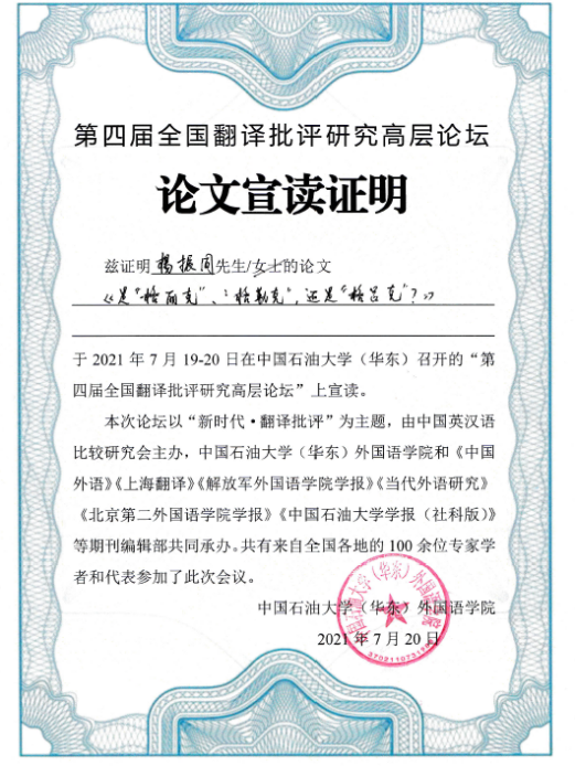 本网讯 2021年7月19-20日,我院翻译系杨振同教授参加了在青岛中国石油大学(华东)举办的“第四届全国翻译批评研究高层论坛”,并宣读论文《是“格丽克”、“格勒克”,还是“格吕克”?》。全国共60多所高校的100多名师生代表参加了此次论坛。