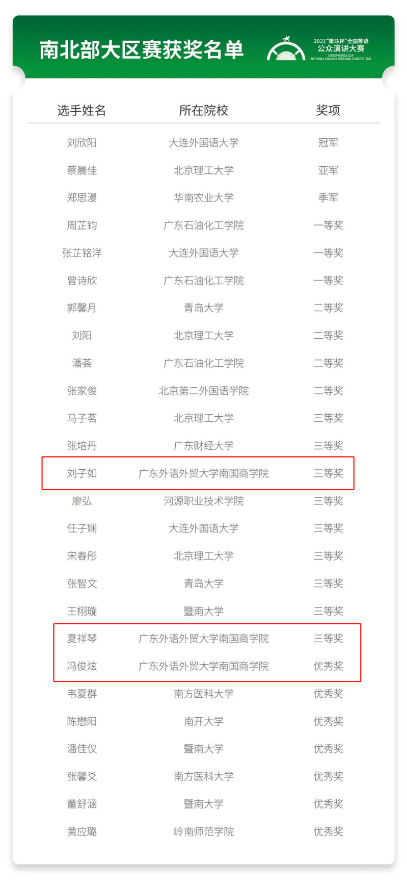 本网讯 11月28日,2021“策马杯”全国英语公众演讲大赛南北大区(广东、广西、北京、天津、辽宁、山东、黑龙江、吉林)线下赛结果公布。我校英语语言文化学院19级翻译2班夏祥琴、20级翻译1班刘子如(指导老师均为方慧)荣获三等奖,20级英语1班冯俊炫(指导老师:巢佳玉)荣获优秀奖。