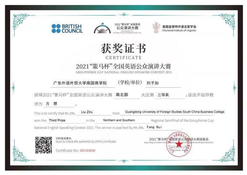 2021“策马杯”全国英语公众演讲大赛南北大区赛包括东三省、京津鲁、华南四省各院校,设奖项26名:冠亚季军各1名、一等奖3名、二等奖4名、三等奖9名、优秀奖7名。该赛事由英国大使馆文化教育处/英国文化教育协会(British Council)官方支持、英国皇家特许语言家学会(Chartered Institute of Linguists,成立于1910年)和北京策马翻译有限公司(联合国官方翻译服务供应商)联合主办。获奖者将获得由英国大使馆文化教育处、英国皇家特许语言家学会共同认证的证书。大赛旨在助力广大中国青年提升英语能力丰富知识储备拓展知识层次、开阔文化视野、增强国际理解能力精进思辨力和创新力。我校学生能从众多参赛选手中脱颖而出,充分彰显了我校英文学院的实力,以及我校“强外语、重实践”的办学特色。