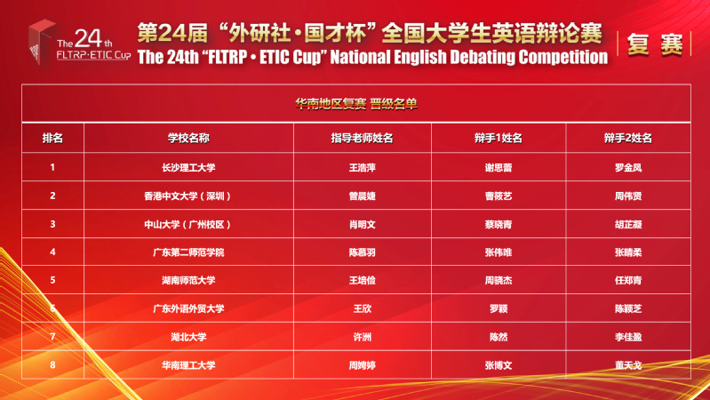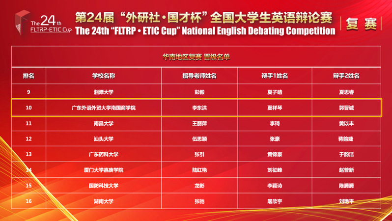 来自华南地区9个省份(广东、广西、海南、贵州、云南、福建、江西、湖北、湖南)共109支队通过预赛参加本次复赛。比赛采用”power-match”机制,第二轮开始,根据上一轮队伍所得积分,匹配获得了同样积分的队伍作为对手。每轮比赛共四支队伍,排名第一获得3分,排名第二获得2分,排名第三获得1分,排名第四获得0分。我院选手夏祥琴、郭晋诚与中山大学、广东外语外贸大学、华南理工大学、华南师范大学、厦门大学等知名院校选手同台竞技,以扎实的语言功底、缜密的思辨能力、娴熟的辩论技巧、流畅的口头表达,在第一轮、第四轮、以及第五轮的比赛中排名第一。经过5轮积分赛的激烈角逐,荣获华南大区赛一等奖,以积分赛第十名的好成绩顺利晋级国赛决赛。