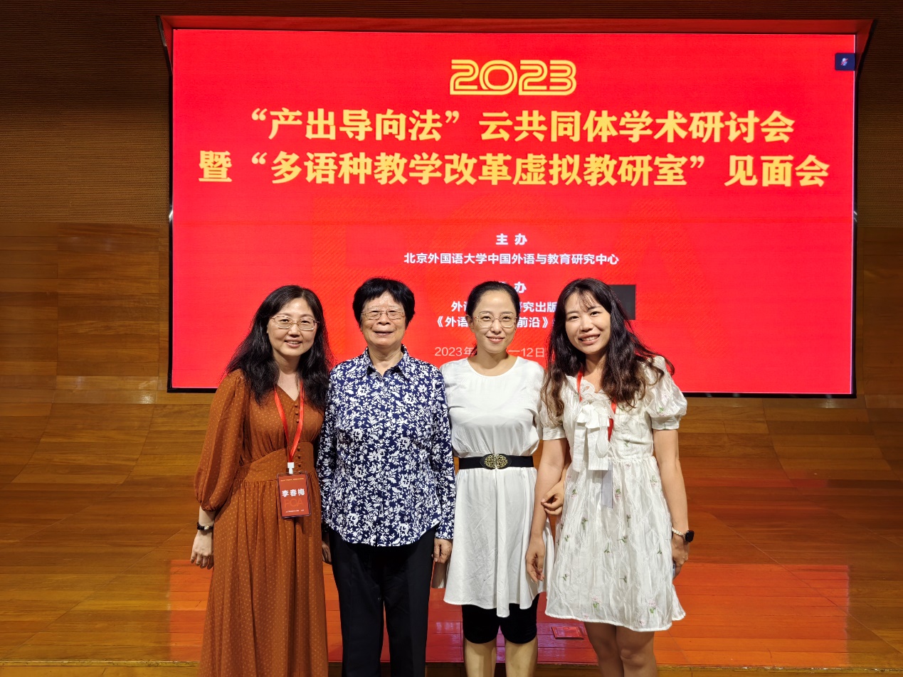 8月11-12日,2023年“产出导向法”云共同体学术研讨会暨“多语种教学改革虚拟教研室”见面会在北京举办。本次会议由北京外国语大学中国外语与教育研究中心主办、外语教学与研究出版社和《外语教育研究前沿》编辑部承办、北京外国语大学“双一流”项目资助,旨在进一步推动中国创新外语教育理论构建与教学实践,探讨信息化时代虚拟教研室建设的理论体系与有效实施途径,进一步增强云共同体成员的认知-社会—情感连接。我院李春梅副院长、方慧副教授、李潇老师参加了本次会议。