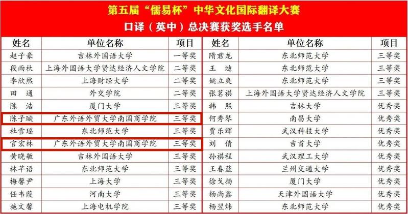 (图1 第五届“儒易杯”中华文化国际翻译大赛口译总决赛获奖名单)