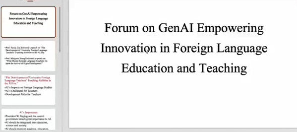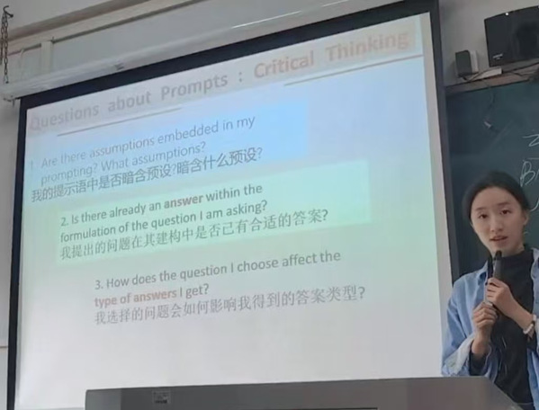 汪子灵参加了广东外语外贸大学欧阳护华教授在“GenAI赋能的外语教育教学创新研究论坛”中所做的讲座。她以“教师数字素质能力提升”为题,做了教师数字素质提升之道、引领教育创新潮的分享。她罗列讯飞星、ChatGPT 等多元 AI 工具,拓展教学资源视野,深度探究 AI 提示词精要。还从教学各阶段出发,依定义概念至行动实践逻辑,为不同场景定制关键词,如理论构建、案例剖析等类,借精准提问激发 AI 潜能。她特别点明,审慎构思提示词是提升教师数字素养之钥。如果能合理运用,可以深挖 AI 辅助效能,革新教学模式、优化教研流程、激发创意源泉,使数字技术深度融合教育肌理,为培育创新人才筑牢根基,有力推动教育朝数字化、智能化跃升,提示当代高校英语教师的数字素质。